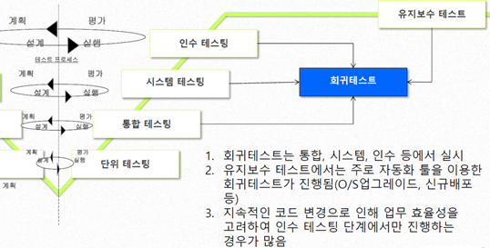 - 테스트 중 발견된 결함의 수정으로 인해 다른 모듈, 기능과의 문제가 없는지, 코드 수정으로 인한 새로운 결함이 없는 지 확인하는 테스트