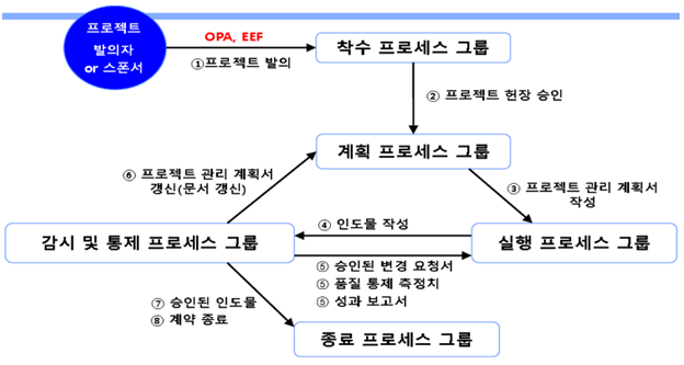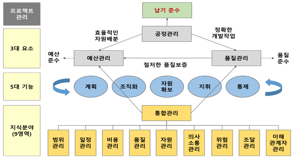 - 프로젝트를 성공적으로 관리하는데 필요한 필수적인 일정, 조직, 인력, 지휘, 통제를 제공하는 절차와 실행 기술/지식 등의 체계