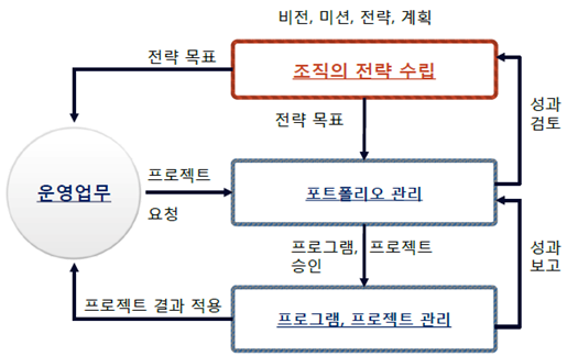 - 전략적 목표에 따라 프로젝트의 진행 상황을 종합적으로 모니터링 함으로써 자원의 효과적 분배와 투자 수익률을 극대화하는 프로젝트 관리 절차