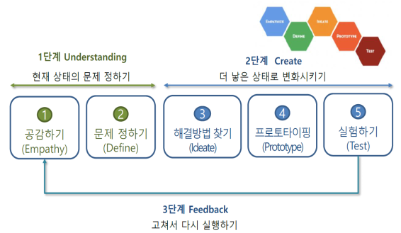 공감, 문제정의, 아이디어 도출, 프로토타이핑, 테스트 |