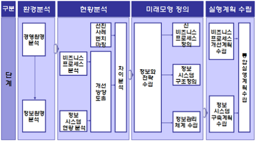 - 조직이 경영목표 및 전략을 효과적으로 지원하기 위한 정보시스템 비전과 전략을 수립하는 과정, 전사 차원의 중장기 정보화 계획
