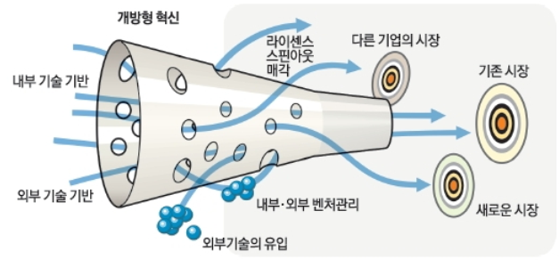 - 제품 아이디어나 기술을 외부에서 도입하여 R&D 기반을 확대하고 내부에서 사업화 되지 않은 기술을 라이선스, 분사 등의 형태로 사업화하는 패러다임