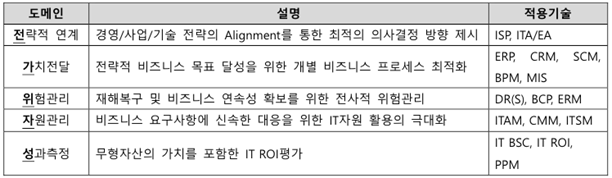 - 비즈니스와 IT간 전략적 연계, 감사 및 관리 절차 개선 및 의사결정 기능 강화