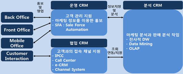 - 마케팅 정보 관리 - 캠페인시스템 : 다양한 채널 활용 - SFA : 영업사원의 대면활동 지원 |