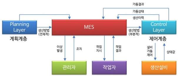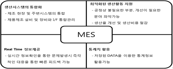 - 수주로부터 최종 제품 완성까지 생산 활동에 최적화 할 수 있는 정보를 제공하며 정확한 실시간 데이터로 공장 활동을 지시하고 대응, 보고하는 제조실행시스템