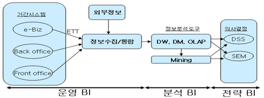 - 기간계 정보와 외부정보를 수집, 통합하여 DW등을 통한 정보 관리와 데이터 마이닝 등을 통한 정보 분석 결과를 제공, 의사결정권자에게 배포