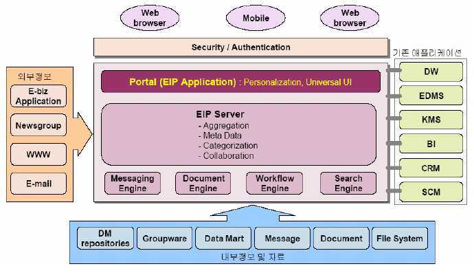- 기업 내/외부 정보를 통합하여 단일화된 화면을 통해 신속한 업무처리와 맞춤정보를 제공하는 기업 포털 솔루션