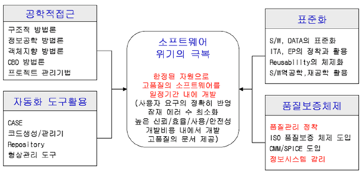 - 소프트웨어의 대규모화, 복잡성 증대에 따른 개발 비용의 증대, 유지보수의 어려움, 개발 적체 현상, 프로젝트 개발 및 소요 예산의 측정 어려움 등 개발 전체 프로세스의 비효율성 증가