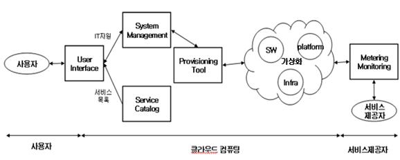 - 클라우드 컴퓨팅에 접속한 사용자는 System Management의 통제 아래 Provisioning tool이 자동 생성한 IT자원을 공급받는 개념