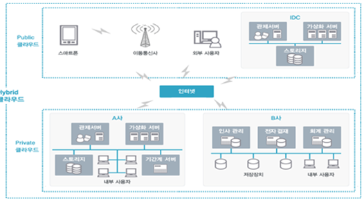 - 사설 클라우드에서 공공 클라우드를 활용하는 방식 - 서비스가 사설, 공공, 커뮤니티로 조합되고 서로 다른 서비스 공급자와의 조합 |