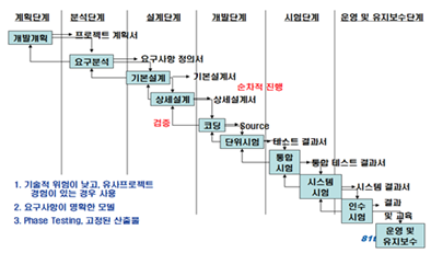- 계획, 분석, 설계, 개발, 시험, 운영/유지보수 과정을 순차적으로 진행하며 단계별 개발을 진행하는 모델