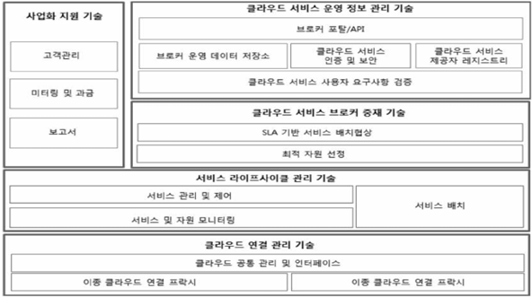 - 이종의 다수 클라우드간 상호 운영성을 지원하기 위해 클라우드를 연동하여 관리하며 클라우드 서비스 제공자와 클라우드 서비스를 소비하는 클라우드 서비스 사용자 간의 중재 시스템