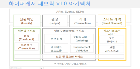 인증을 위한 멤버십 서비스, 분산원장관리를 위한 블록체인 서비스, 보안 컨테이너인 체인코드 서비스로 구성 |