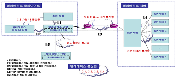 - 위 세가지 구성요소와 이들 구성요소간의 표준화된 인터페이스를 통해 텔레매틱스 서비스 제공