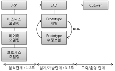 - Joint Application Design - 설계단계로 사용자와 함께 개략적 모델링 이후 설계를 진행 - 빠른 구현을 위한 CASE Tool 활용 |