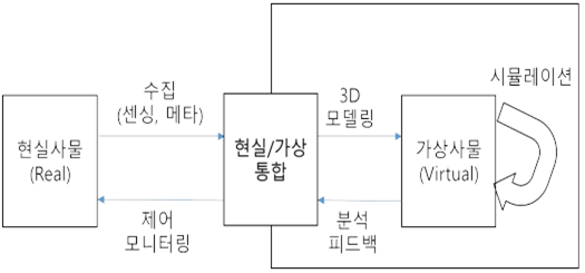 - 센서 및 액츄에이터에서 수집되는 데이터 기반 모델링을 통해 물리적인 사물을 가상공간에 동일하게 표현하여 모니터링, 제어가 가능하도록 하는 기술