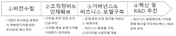 - 강력한 비전 소유한 최고위급 경영진에서 조직 전체로 비전 - 시장, 기술, 고객 등의 디지털 환경 변화 요인 분석 - 자사의 내재화된 핵심역량파악, 기업문화&조직체계 개선 - 디지털 기술도입 및 지속적 R&D 혁신 |