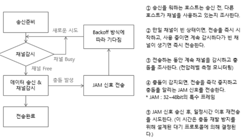 - 경쟁을 기반으로 하는 전송 방식으로 만일 전송 채널이 바쁜 상태라면 얼마 동안 기다렸다 다시 전송을 시도하는 방식