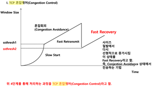 윈도우 사이즈를 절반에서 다시 선형적으로 증가, Congestion Avoidance 상태에서 전송하는 기법 |