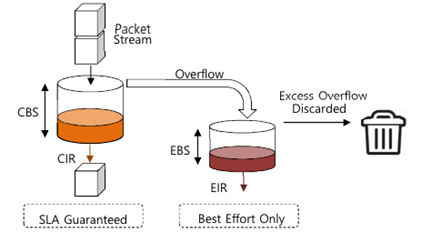 - 트래픽 허용 버스트 크기를 초과하여 Overflow 발생 시 초과 패킷 버퍼링