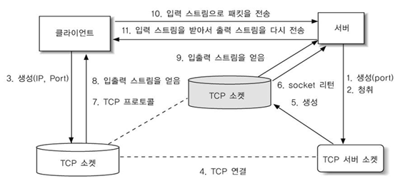 - 신뢰성 있는 TCP 프로토콜을 이용하여, 연결지향 방식으로 네트워크의 끝 부분에서 데이터를 읽고 쓰는 소켓 통신