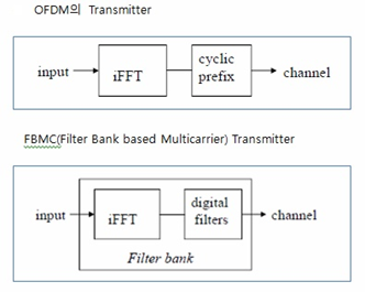 - 다수의 필터를 이용하여 다수의 반송파에 다수의 서로 다른 심벌을 주파수 효율적으로 동시에 전송하는 기술 (OFDM과 비교) ![]() |