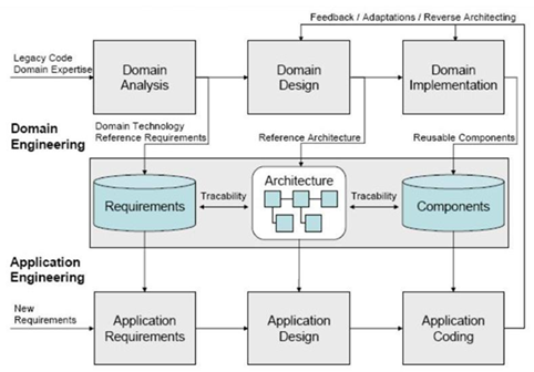 - 동일한 시스템 군을 기반으로 개별 소프트웨어를 개발하는 활동으로 개별 제품의 요구 사항에 의존적이고 Core Asset을 조립하여 신속하게 소프트웨어 개발 |