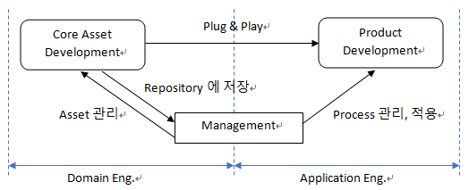 - 재사용 단위인 Core Asset은 Product의 공통 부분을 찾아내고 Core Asset을 상황에 맞게 수정하여 어플리케이션 개발