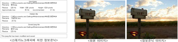 - 스테가노그래피를 사용해 이미지에 기밀정보를 삽입하였지만, 사용자가 육안으로 식별하기는 불가능 - 스테가노그래피의 약점은 다량의 데이터를 은닉하는 데는 제한이 있으며 통계적 분석 방법에 의해 숨겨진 데이터의 검출이 용이 - 스테가노그래피 분석을 위해 통계적 분석방법을 통해 은닉정보를 탐지하며 패스워드 무차별 대입 방법을 통해 정보를 확인 할 수 있다. - 최근에 스테가노그래피를 확인할 수 있는 공개 소프트웨어 및 상용 제품이 많이 보급되고 있으나, 점차 정보은닉의 방법 지능화, 고도화 되어가고 있다. |