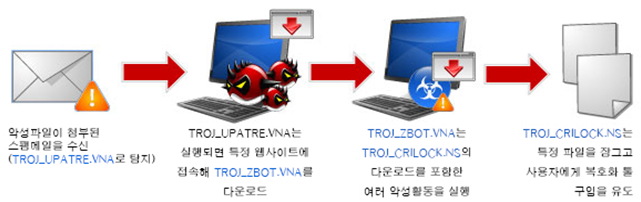 - 랜섬웨어는 이메일을 통해 배포되며 일부는 안티바이러스를 우회하기 위해 설치 이후 암호화 모듈을 별도로 다운받아 수행