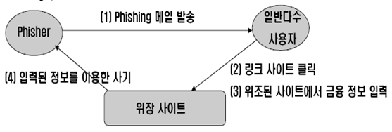 - 개인정보를 불법으로 획득하려는 사람이 금융기관 등을 사칭하여, 다수의 이메일을 사용자에게 신용카드나 은행계좌 정보에 문제가 발생해 수정이 필요하다는 등의 거짓 이메일, 전화 등을 이용해 개인정보를 빼내는 불법적인 범죄행위
