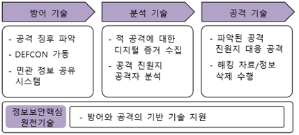 - 정보보안 원천 기술을 근간으로 사이버 전쟁 발발 시, 방어, 분석, 공격절차 수행이 필요하며 각각의 영역에 대한 보안기술 필요
