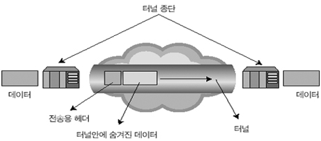 - 통신망 상의 두 점 간의 통신이 되도록 하위 계층 통신 규약의 패킷을 상위 계층 통신규약으로 데이터를 캡슐화해서 수신자 이외에는 알아볼 수 없도록 전송하는 기술