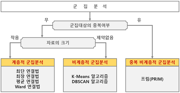 - 군집분석의 경우 빅데이터 기반의 집단을 분류하는 용도로 사용되어 비계층적 군집분석을 주로 활용