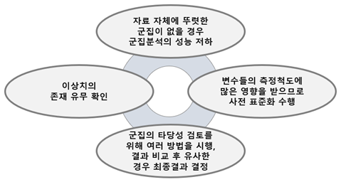 - 군집분석 수행 시 집단에 대한 정보가 없을 때, 객체들사이의 유사성을 근거로 자율적으로 군집을 형성시키는 다변량 분석 기법으로 위와 같은 문제들을 유의하여 사용
