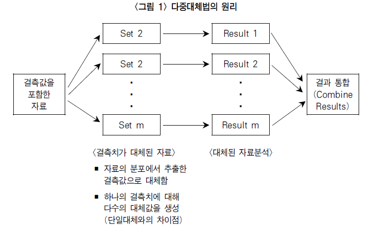 ![]() - 한번 이상 결측을 대체 - 대체한 완전한 데이터 셋트 m(m>1)개 만들어서 모수 측정한 후 모수 추정치와 표준오차를 결합하여 모형 개발 - 대체값을 구한 후 자료 분석 추정된 계수 통합 |
