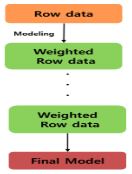 1) Row Data에 동일 가중치로 모델 생성 2) 생성된 모델로 인한 오 분류 데이터 수집 3) 오 분류 데이터에 높은 가중치 부여 4) 과정 반복을 통하여 모델의 정확도 향상 - Boosting은 잘못 분류된 데이터에 집중해 모델의 정확도를 향상시키는 방법 |