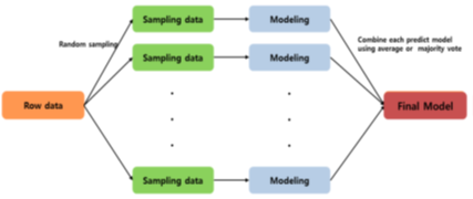 1) Row Data에서 Bootstrap 데이터 추출 2) 추출을 반복하여 n개의 데이터 생성 3) 각 데이터를 각각 모델링 하여 모델 생성 4) 단일 모델을 결합하여 Bagging 모델 생성 - 여러 번의 샘플링을 통해 분산을 줄여 모델의 변동성을 감소시키는 방법 |
