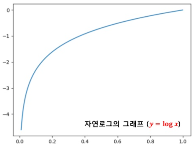 - 정답이 아닌 출력 노드의 레이블 값은 0이므로 정답일 때의 출력만 전체 손실 값을 정하는데 사용 - 자연로그 그래프 - x가 1일 때 y는 0 - x가 0에 가까워질수록 y값은 작아진다. - x가 0이면 y는 –inf(무한대)가 된다 |