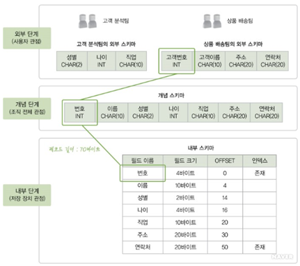 - 데이터베이스 관리 측면에서 데이터베이스를 외부/개념/내부 3단계로 구별하여 구조와 그 관계를 기술