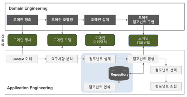 - 도메인 명세서 작성, 명세서를 바탕으로 도메인 분석, 컴포넌트 추출하여 도메인 아키텍처를 생성, 도메인 컴포넌트 구현