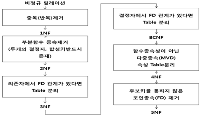 - 관계형 데이터베이스 모델에서 데이터의 중복을 제거하여 삽입, 갱신, 삭제 이상현상을 방지하기 위한 무손실 분해 과정