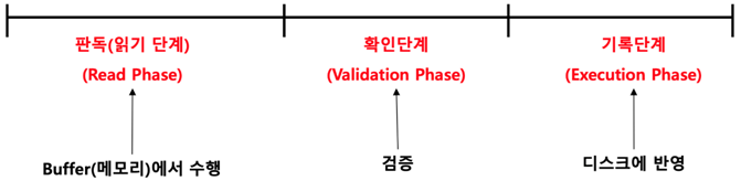 - 판독 단계에서 사본에 반영된 트랜잭션의 실행 결과를 데이터베이스에 반영 전 직렬 가능성 위반여부를 확인 |