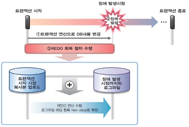 - 장애 발생 시 진행된 트랜잭션에 대해 로그 기록을 이용하여 재실행함으로써 데이터베이스 상태 복원