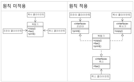 클라이언트가 사용하지 않는 메소드는 의존 관계가 있으면 안된다. |