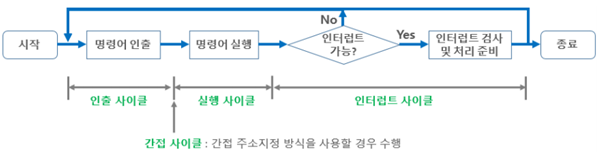- 한 명령어를 실행하는데 필요한 전체 과정으로서 명령어 인출/간접/실행/인터럽트 단계로 나누어짐