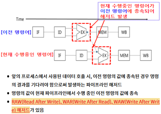 - 명령의 값이 현재 파이프라인에서 수행 중인 이전 명령의 값에 종속 (세부적으로 RAW, WAR, WAW 해저드가 있음. RAR은 해저드가 아님) |