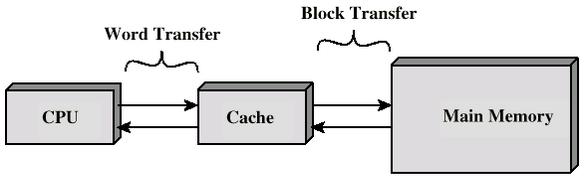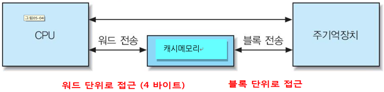 - CPU와 주기억장치의 속도 차이를 극복하기 위하여 CPU와 주기억장치 사이에 위치한 소형 고속 메모리(SRAM 사용)