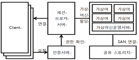 - 사용자 단말기와 가상화 엔진의 접점에서 사용자 인증 등 정책을 적용하고 접속 요청에 따라 어떠한 가상머신을 사용자에게 전달할 지에 대한 정보를 저장하는 장비 |