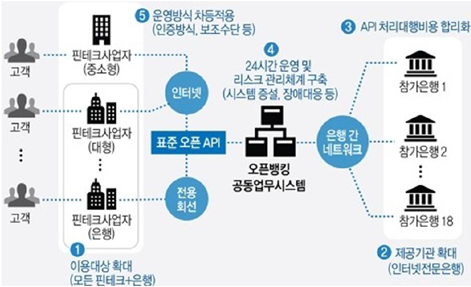 - 핀테크 기업 및 은행들이 표준 방식(API)으로 모든 은행의 자금이체, 조회 기능을 자체 제공할 수 있는 시스템